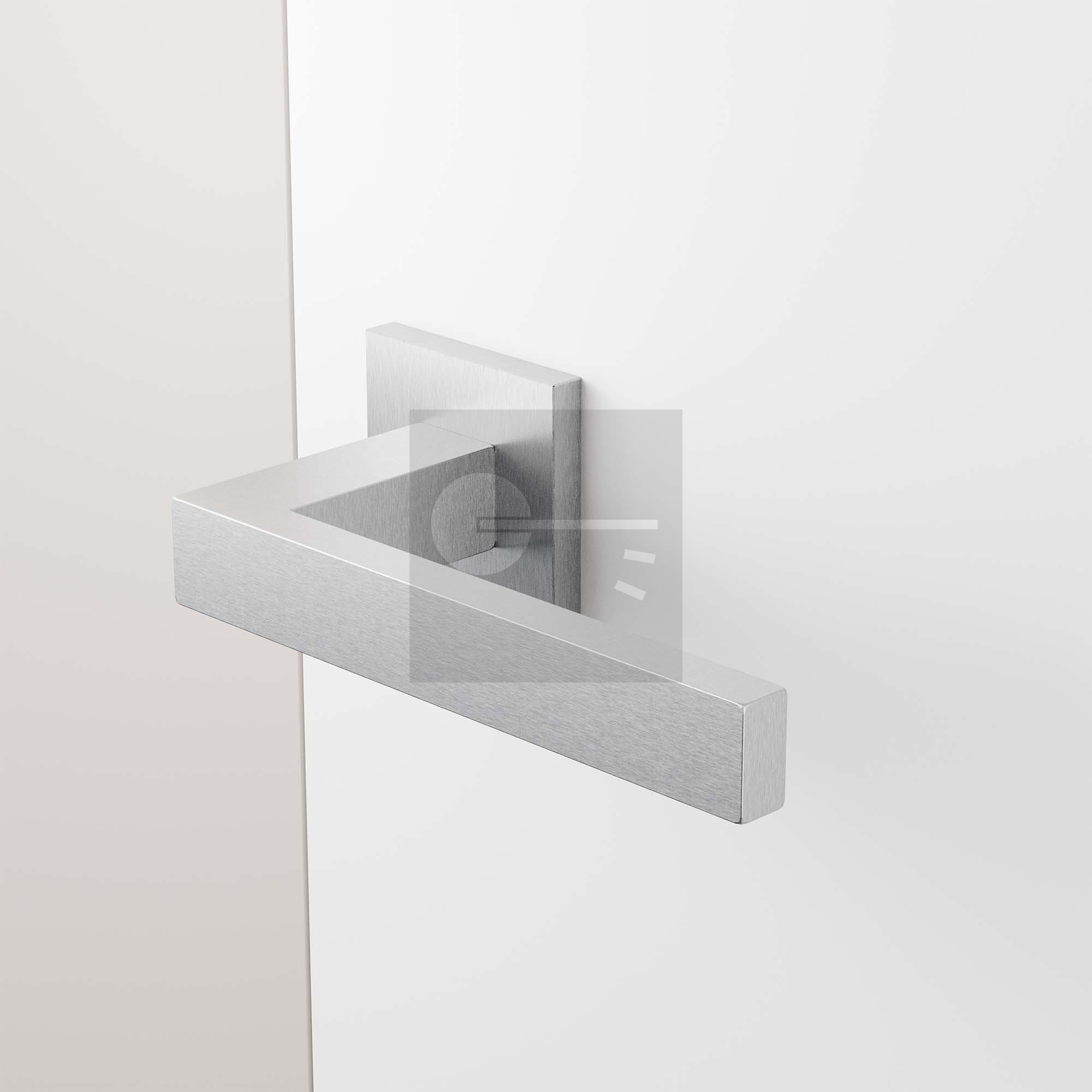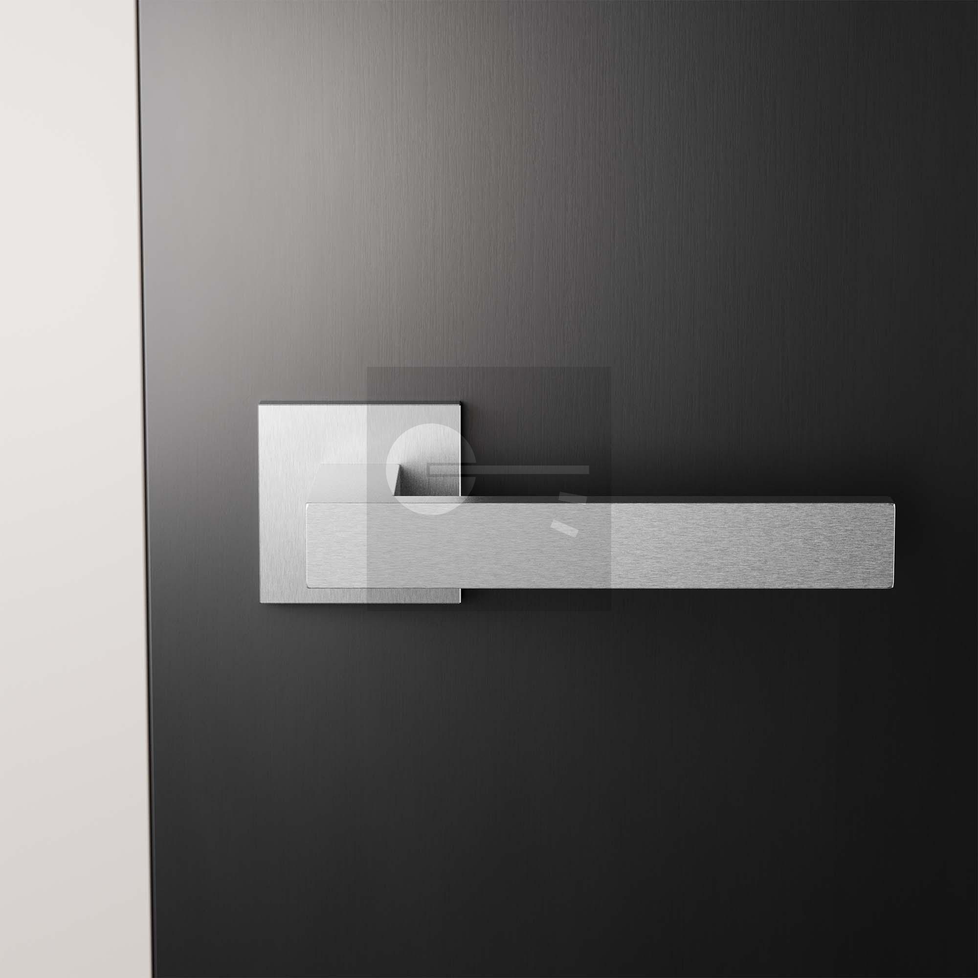 Stainless steel satin Zika door handle on square rose 50x50x8mm.